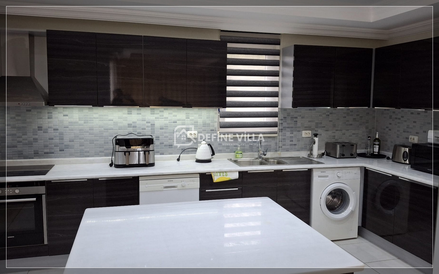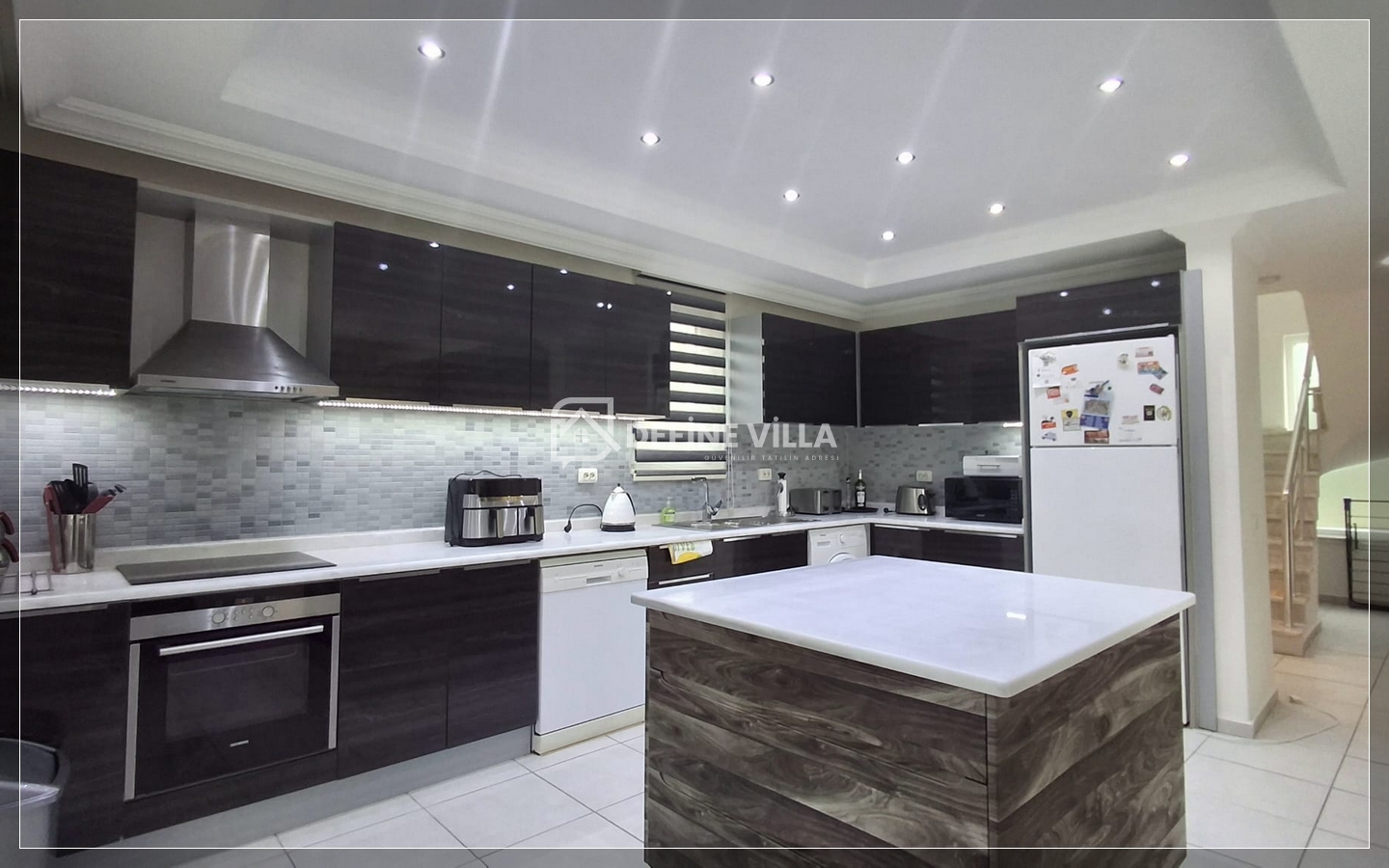 Geniş mutfak alanında kahvaltı masası, çamaşır makinesi, bulaşık makinesi ve mikrodalga fırın yer almakta; ayrıca havuza bakan ayrı bir yemek alanı bulunmaktadır. Salonda masa oyunları ve kitaplar misafirlerin kullanımına sunulmuştur.
