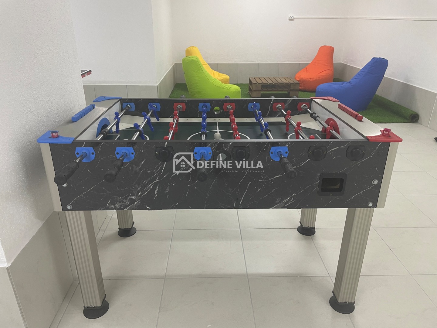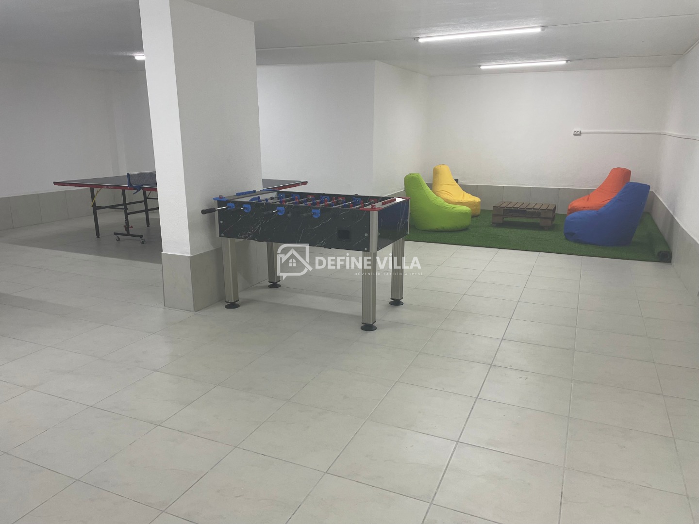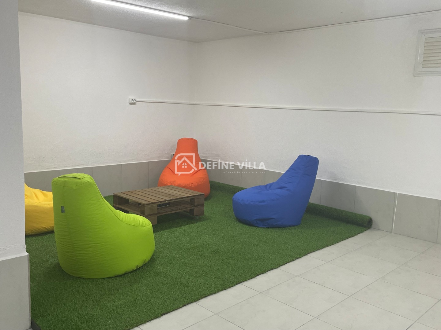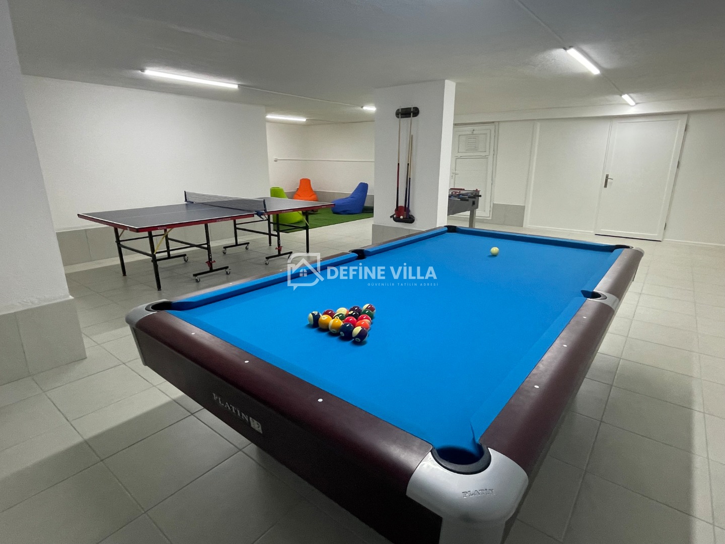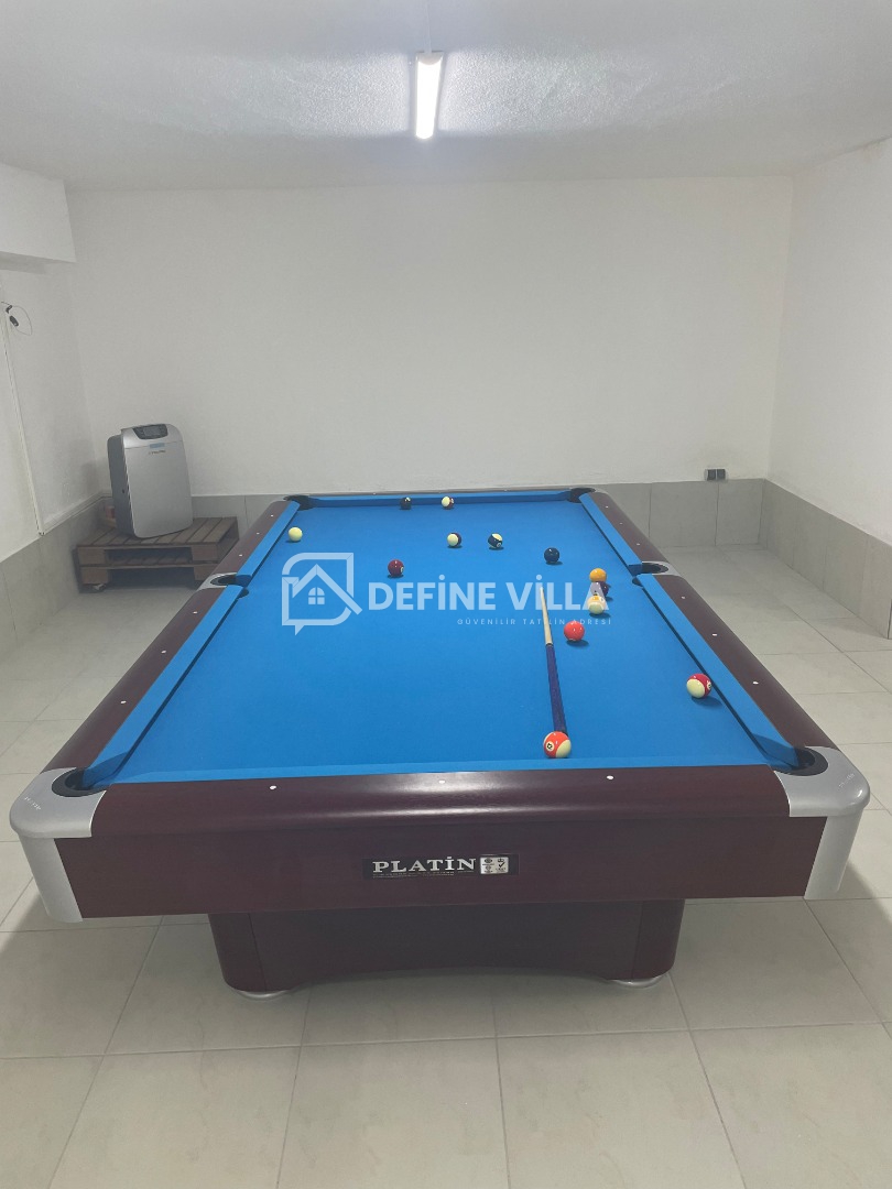 Dış alanda büyük bir yüzme havuzu, şezlonglar ve şemsiyeler, bacalı barbekü ve açık hava yemek alanı yer almaktadır. Villanın arka bölümünde ise güneşten uzak, dinlenmeye uygun bakımlı bir bahçe bulunmaktadır. Villanın öne çıkan özelliklerinden biri de hem yetişkinler hem de çocuklar için keyifli vakit geçirme imkânı sunan oyun odasıdır.