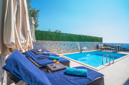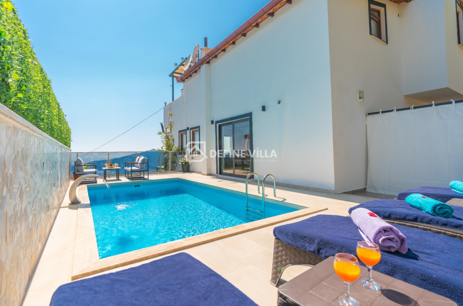 Villa Alkımbade Kalkan Kördere'de 3 yatak odası 6 kişilik kapasiteli deniz manzaralı havuz alanı korunakl villadır.Şehir merkezine 5km mesafede bulunan evimizin 2 yatak odasında jakuzi bulunmaktadır.