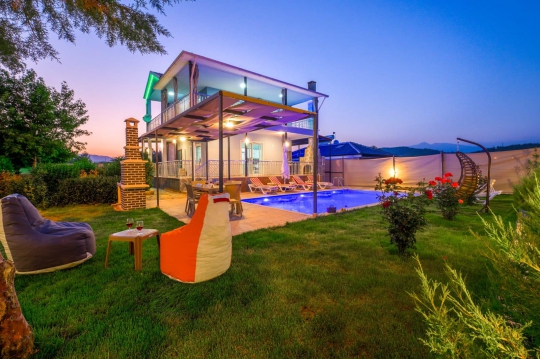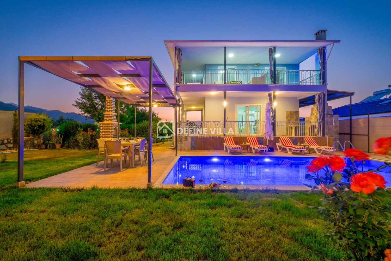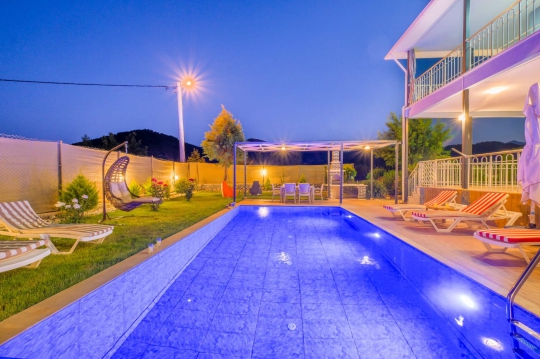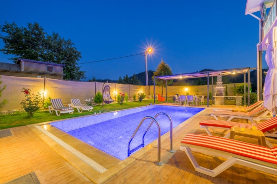 Muğla Seydikemer'de havuz alanı korunaklı 2023 yapımı 4 yatak odası 8 kişi kapasiteli özel havuzlu ve çocuk oyun alanlı tatil villasıdır.