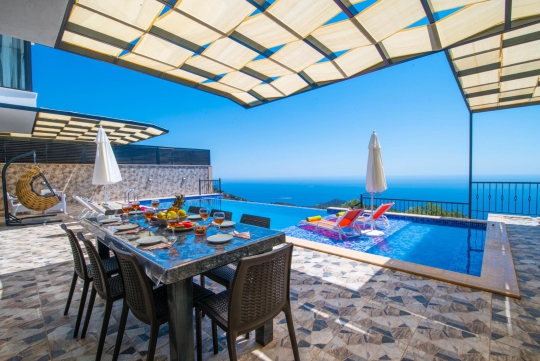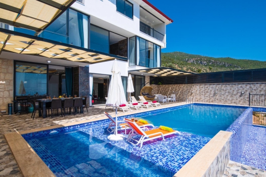 Villa izo,Kalkan Ordu mevkisinde 4 yatak odalı 8 kişi kapasiteli harika deniz manzaralı lüks villadır.Villada tatil için misafirlerimizin her türlü rahatı düşünülmüş olup,jakuzi,hamam,sauna ve kapalı ısıtmalı havuzu bulunmaktadır.2 katlı olan villamızın her odasında panoramik deniz manzarası bulunmaktadır.Havuz alanı korunaklı olan villamız muhafazakar aileler içinde harika bir seçimdir.