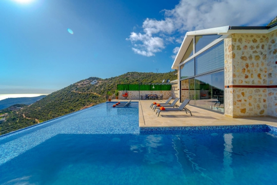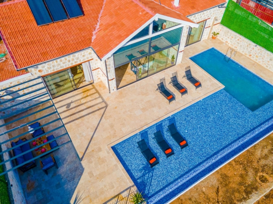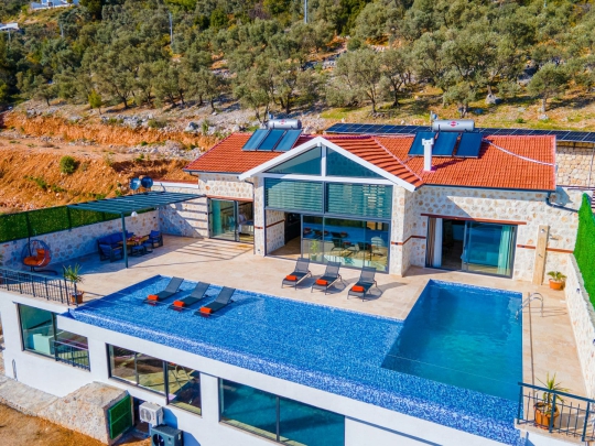 Villa Lorin,Kalkan Kördere'de 3 yatak odası 6 kişilik kapasiteli sonsuzluk havuzlu lüks taş villadır.Havuz alanı korunaklı olan villamız muhafazakar aileler için uygun olup,çocuklu aileler için çocuk havuzu da bulunmaktadır.