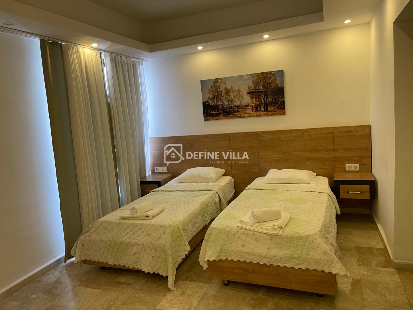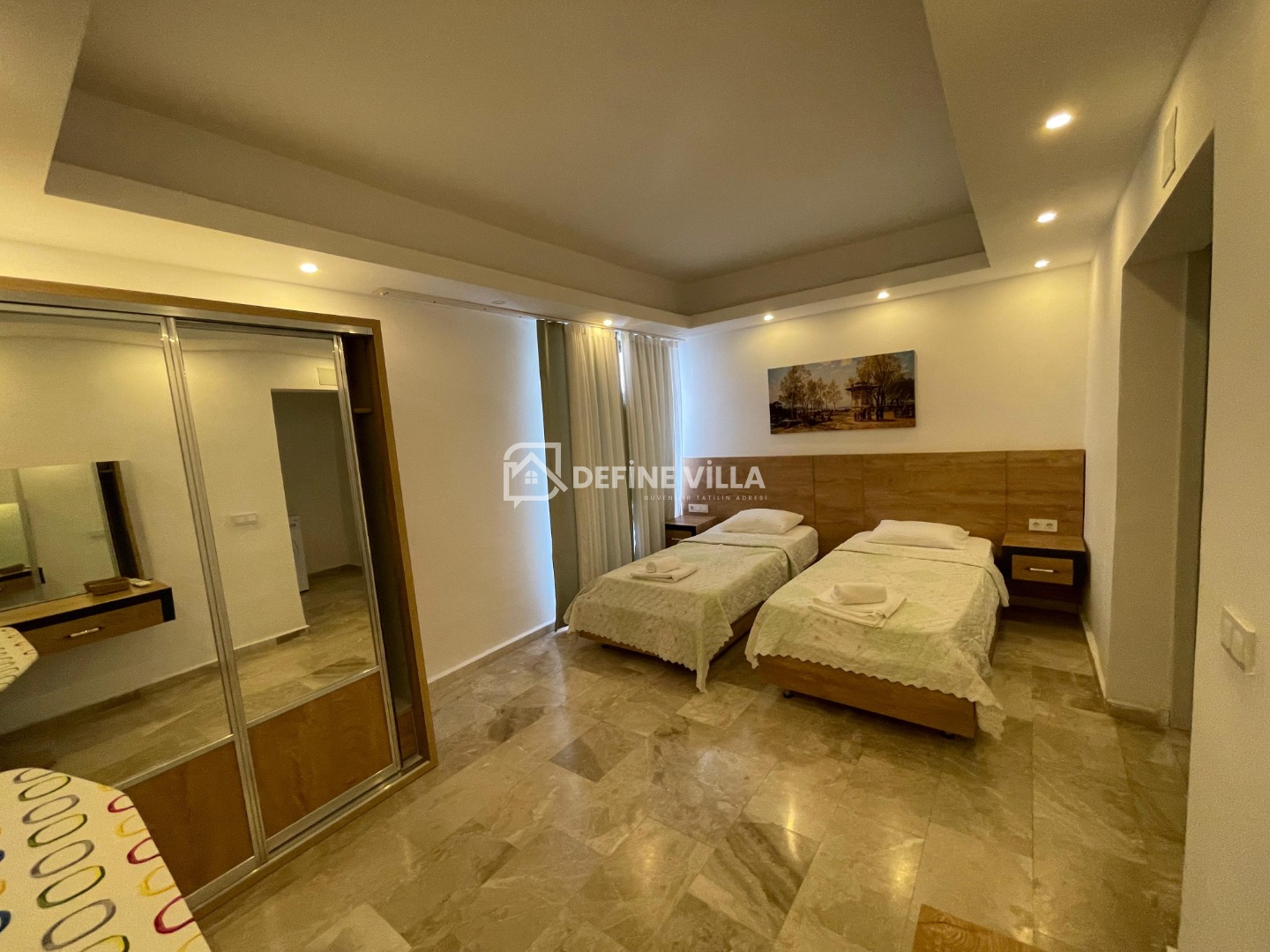 Villamız 2 yatak odasından oluşmaktadır. Yatak odalarının birinde çift kişilik yatak, diğerinde ise 2 adet tek kişilik yatak bulunmaktadır. Modern ve ferah şekilde dizayn edilen iç mekânlar, konforlu bir tatil için ihtiyaç duyabileceğiniz tüm detayları sunmaktadır.