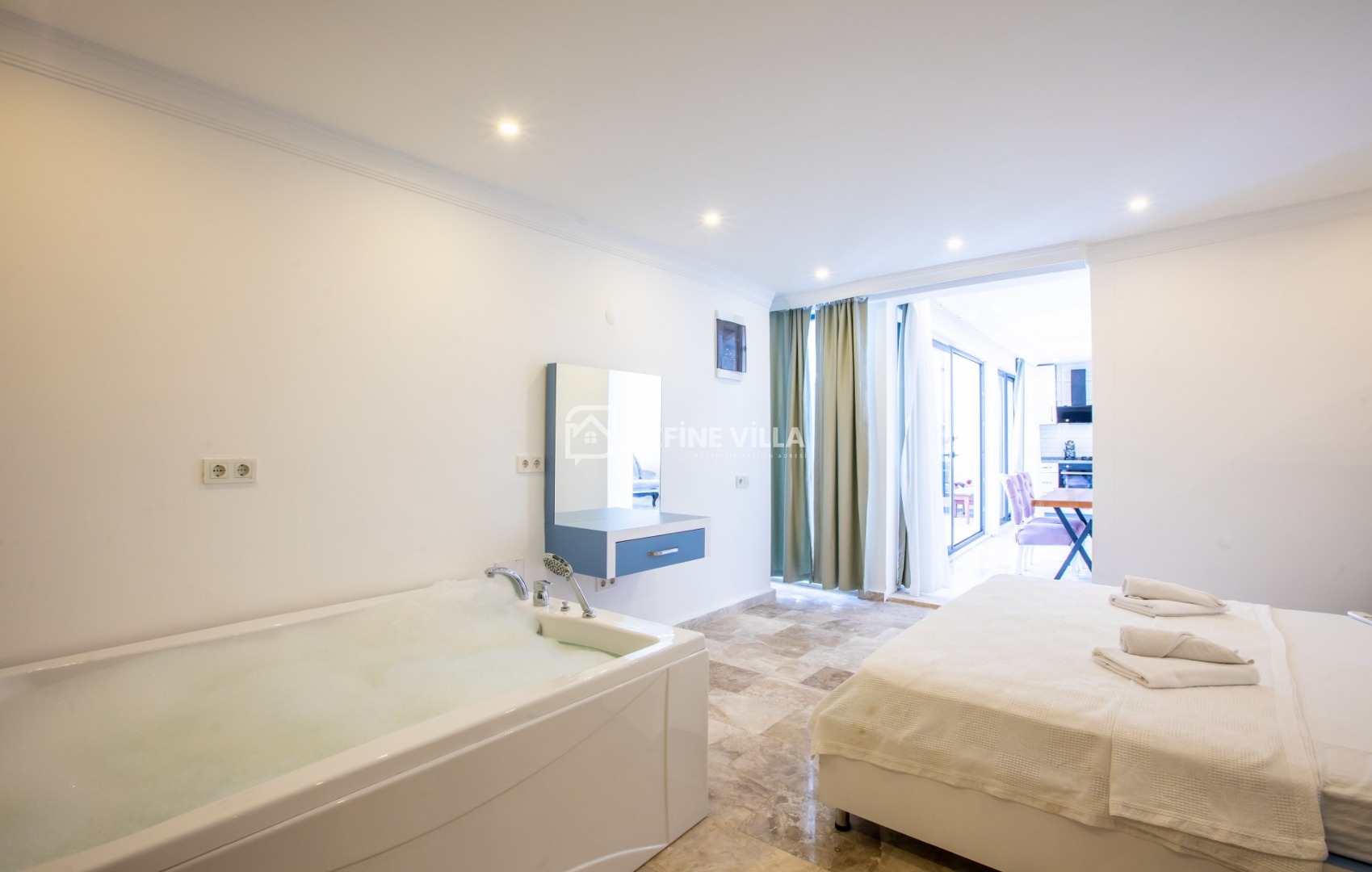 Modern ve şık tasarımıyla dikkat çeken villamız, deniz manzarasına hâkim konumu sayesinde günün her anında eşsiz manzaralar sunar. Konforlu yaşam alanları, keyifli vakit geçirebileceğiniz sinema odası ve rahatlatıcı jakuzisi ile tatilinize ayrıcalık katar.